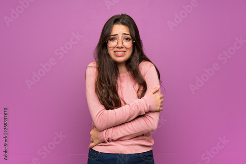 Teenager girl over purple wall freezing