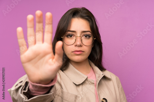 Teenager girl over purple wall making stop gesture with her hand
