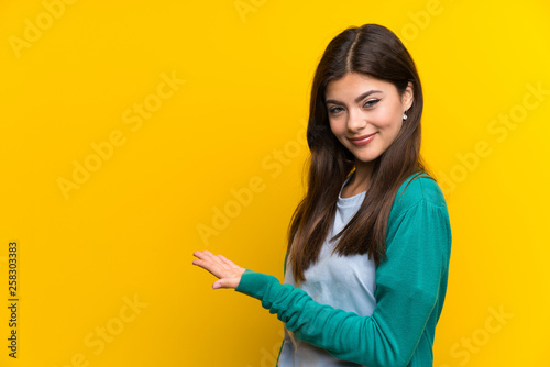 Teenager girl over yellow wall extending hands to the side for inviting to come