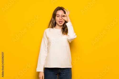Teenager girl over yellow wall makes funny and crazy face emotion