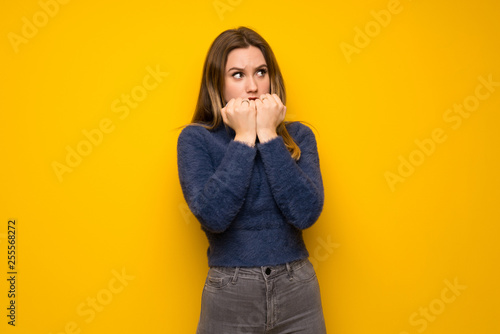 Teenager girl over yellow wall nervous and scared putting hands to mouth