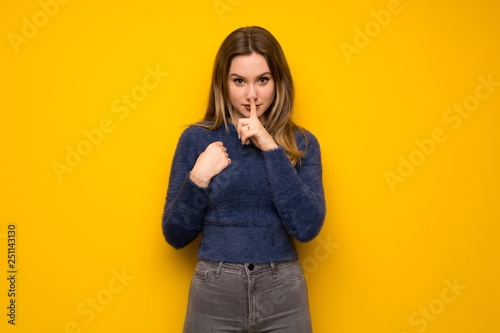 Teenager girl over yellow wall showing a sign of silence gesture putting finger in mouth