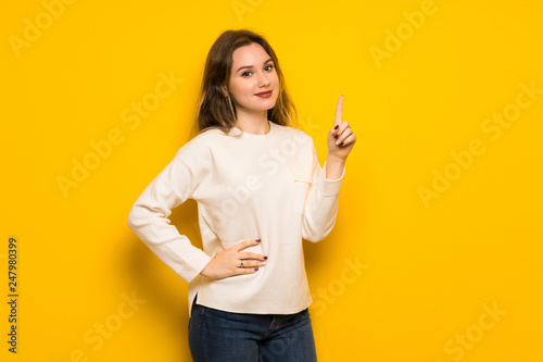 Teenager girl over yellow wall showing and lifting a finger in sign of the best