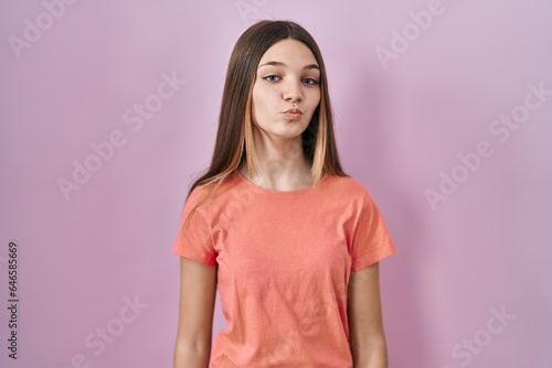 Teenager girl standing over pink background looking at the camera blowing a kiss on air being lovely and sexy. love expression.