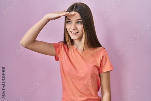 Teenager girl standing over pink background very happy and smiling looking far away with hand over head. searching concept.