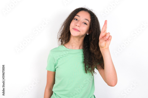 Teenager girl with afro hairstyle wearing green T-shirt over white wall pointing up with fingers number ten in Chinese sign language Shi