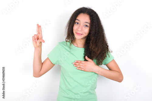 Teenager girl with afro hairstyle wearing green T-shirt over white wall smiling swearing with hand on chest and fingers up, making a loyalty promise oath.