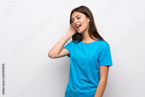 Teenager girl with blue shirt listening to something by putting hand on the ear