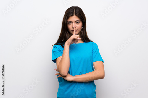 Teenager girl with blue shirt showing a sign of silence gesture putting finger in mouth