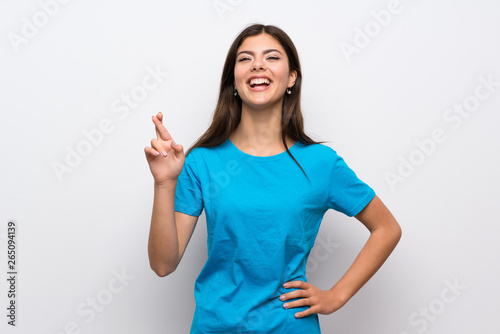 Teenager girl with blue shirt with fingers crossing and wishing the best