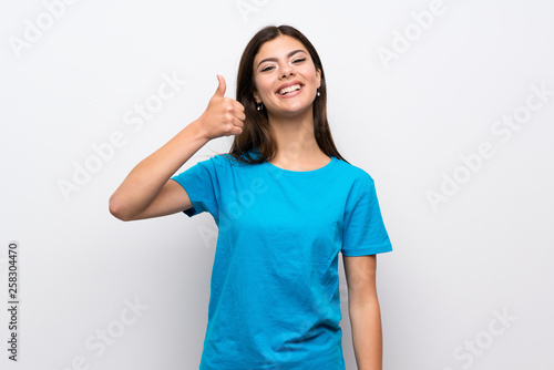 Teenager girl with blue shirt with thumbs up because something good has happened