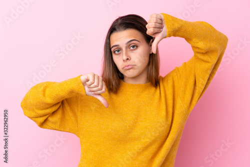 Teenager girl with yellow sweater over isolated pink background showing thumb down
