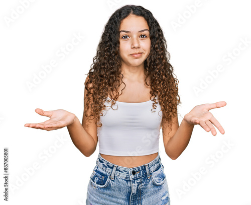 Teenager hispanic girl wearing casual clothes clueless and confused expression with arms and hands raised. doubt concept.