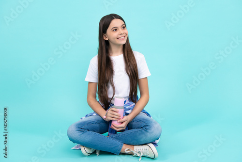 Teenager in casual wear hold water bottle. Hipster teen. Happy teenager, positive and smiling emotions of teen girl.