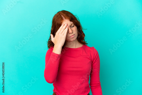 Teenager reddish woman isolated on blue background with headache