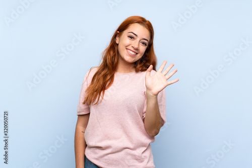 Teenager redhead girl over isolated blue background saluting with hand with happy expression