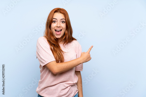 Teenager redhead girl over isolated blue background surprised and pointing side