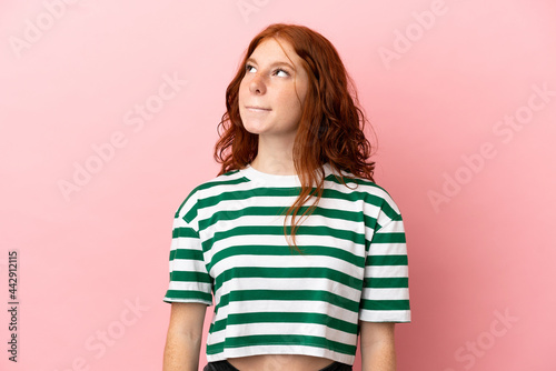 Teenager redhead girl over isolated pink background having doubts while looking up