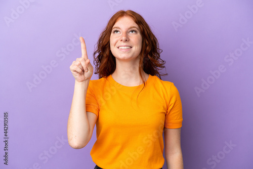 Teenager redhead girl over isolated purple background intending to realizes the solution while lifting a finger up