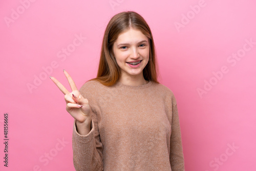Teenager Russian girl isolated on pink background smiling and showing victory sign