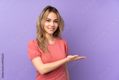 Teenager Russian girl isolated on purple background presenting an idea while looking smiling towards
