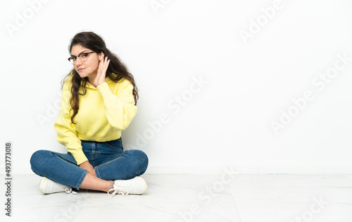 Teenager Russian girl sitting on the floor listening to something by putting hand on the ear