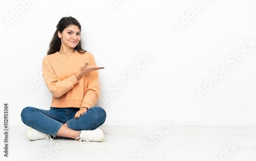 Teenager Russian girl sitting on the floor presenting an idea while looking smiling towards