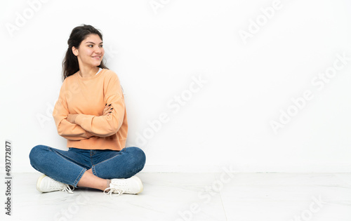 Teenager Russian girl sitting on the floor with arms crossed and happy