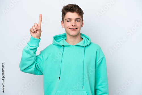 Teenager Russian man isolated on white background pointing up a great idea