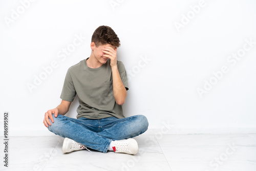Teenager Russian man sitting on the floor isolated on white background laughing