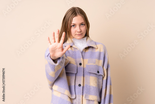 Teenager Ukrainian girl isolated on beige background making stop gesture