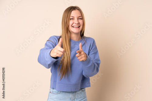 Teenager Ukrainian girl isolated on beige background surprised and pointing front