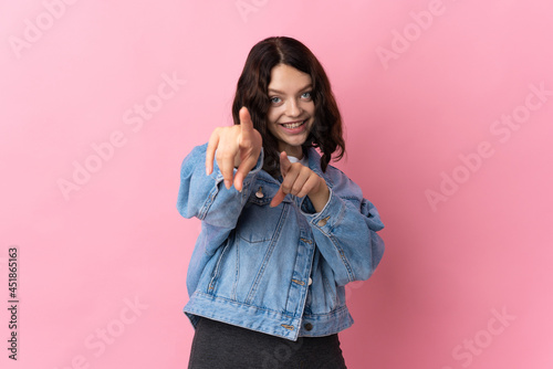 Teenager Ukrainian girl isolated on pink background pointing front with happy expression