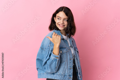 Teenager Ukrainian girl isolated on pink background pointing to the side to present a product