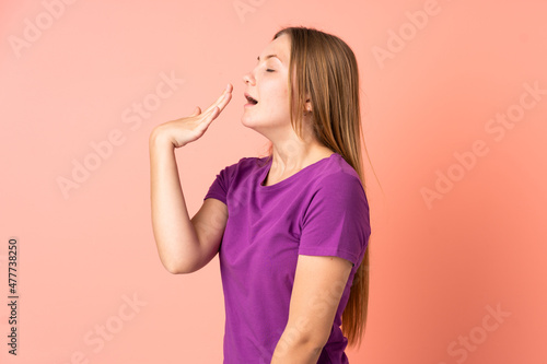Teenager Ukrainian girl isolated on pink background yawning and covering wide open mouth with hand