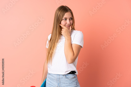 Teenager Ukrainian skater girl isolated on pink background with a skate and looking lateral