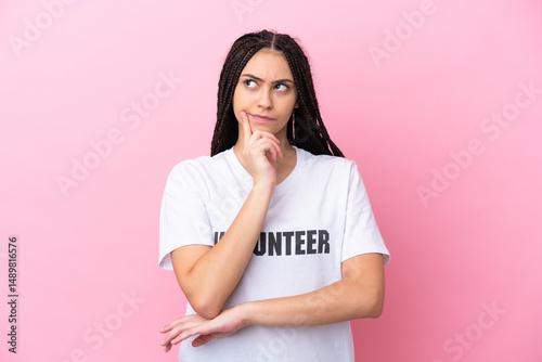 Teenager volunteer girl with braids isolated on pink background having doubts while looking up