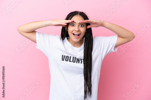 Teenager volunteer girl with braids isolated on pink background with surprise expression