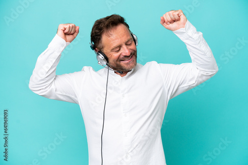 Telemarketer caucasian man working with a headset isolated on blue background celebrating a victory