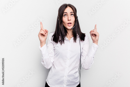 Telemarketer caucasian woman working with a headset isolated on white background pointing upside with opened mouth.
