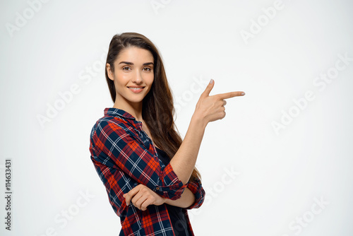 Tender girl dressed in plaid shirt smiling and pointing finger.