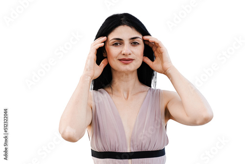 Tender woman with vitiligo pigmentation patches on hands on white background. Lifestyle with skin seasonal diseases.