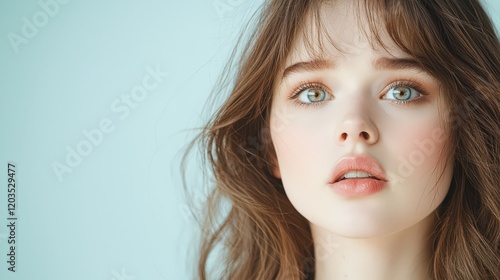 The camera zooms in on a Caucasian lady with fair skin and long brown hair, her eyes wide and filled with emotion as she gazes off into the distance, her lips slightly parted in anticipation