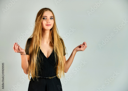 The concept of fashion and style. Portrait of a pretty blonde girl with long hair and great makeup on a white background. The model stands in different poses in front of the camera.
