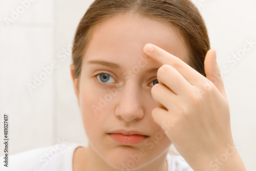 the face of a teenage girl, she looks at herself in the mirror and touches her face with her hand, good and clean skin is a concept of beauty and health