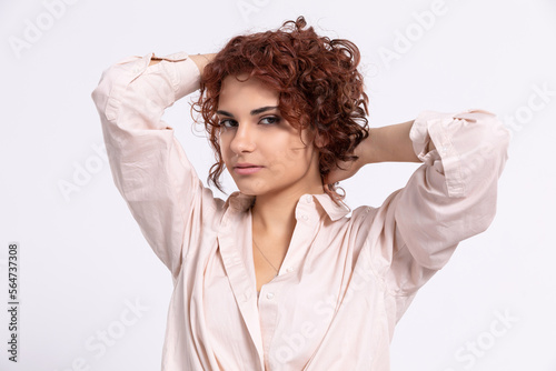 The girl corrects her curly hair with two hands. European.