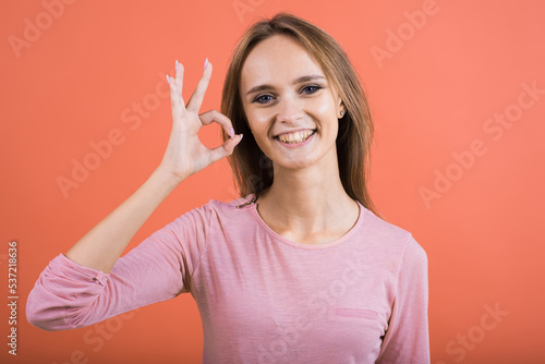 The girl shows an Okay gesture, approvе and agree on a red background.