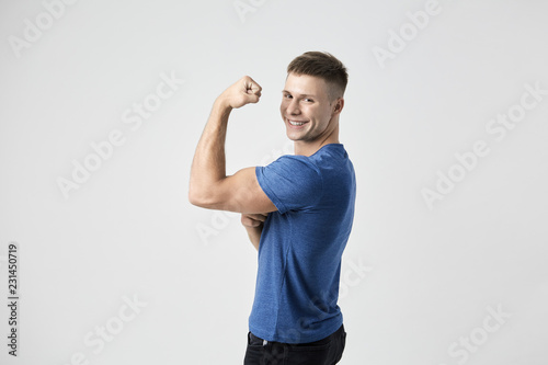 The guy dressed in blue t-shirt feels full of strength and energy. Studio shot on white background