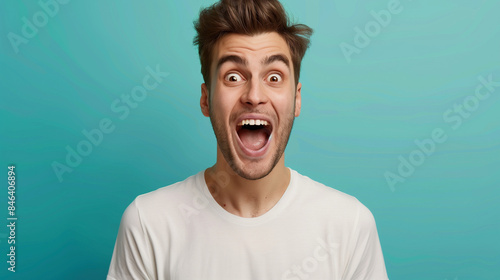 The handsome man seems surprised and excited, his face radiates joy and a smile.