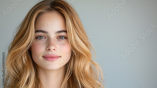 The headshot features a young woman with long, blonde hair styled in loose waves, wearing a subtle pink lipstick